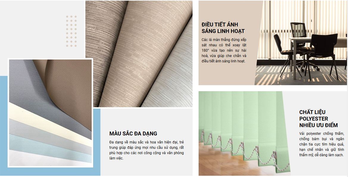 Màn sáo dọc được làm bằng vải phủ nhựa không thấm nước, chống nắng, cách nhiệt tốt. Chống bám bụi và dễ vệ sinh