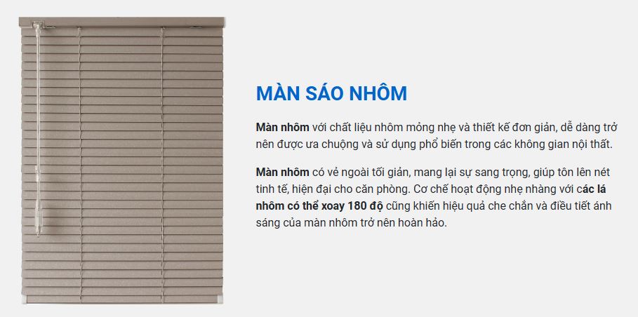 Rèm sáo nhôm hay còn gọi là màn sáo ngang. Rèm được làm từ những lá nhôm có bản 2.5cm, các lá nhôm được sơn màu tĩnh điện nên chống han gỉ, chịu được nước và độ ẩm cao. Có hơn 20 màu cơ bản. Tông màu đa dạng, phù hợp với mọi phong cách nội thất.