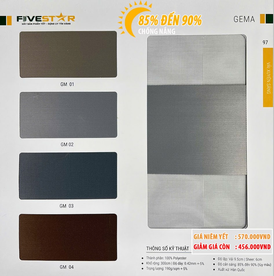 Bảng màu và thông số kỹ thuật rèm cầu vồng FIVESTAR mã Gema