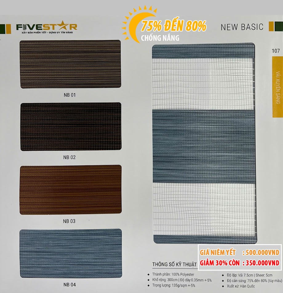 Bảng màu và thông số kỹ thuật rèm cầu vồng hãng FIVESTAR mã New Basic