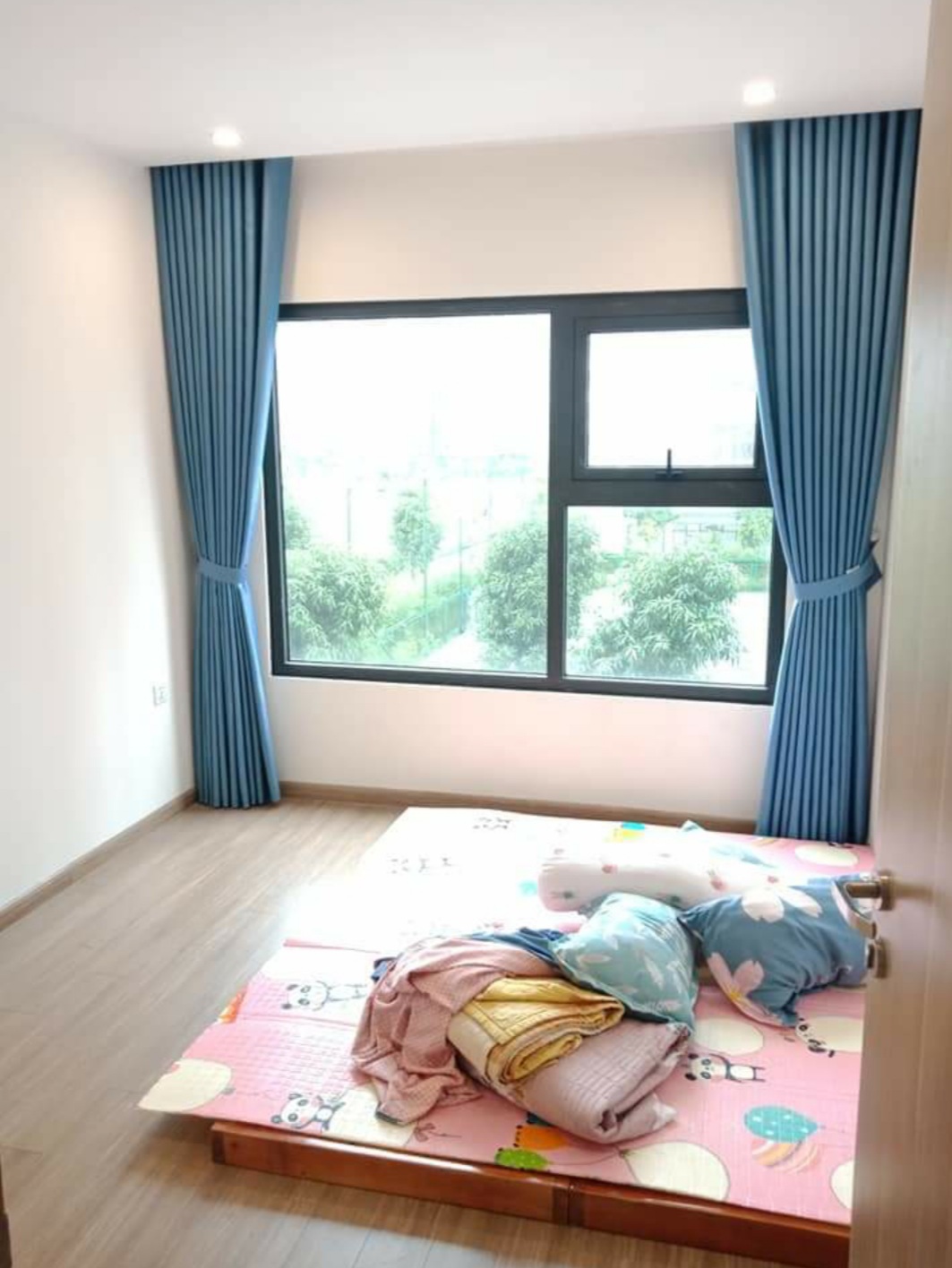 Rèm vải 1 lớp màu xanh cản nắng tốt cho phòng ngủ chung cư